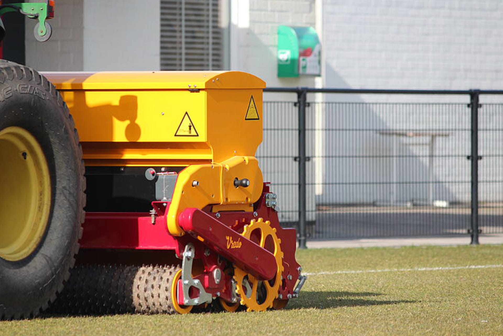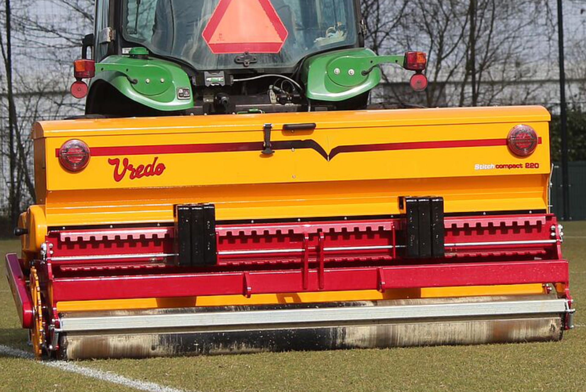 Situations and moments occur every season when the recovery capacity of the turf is minimal, or the soil is too loose and sandy to sow with the double disc principle. At these times, the market demands improved sowing techniques without cutting the sward, while maintaining the Vredo quality and grass emergence. The Stitch Compact from Vredo offers the solution. Two so-called stitch rollers, with a sharp flat tooth, create interrupted incisions that enclose the dosed seeds. An even seeding pattern is created by making 1,600 small incisions per m2. Inserting and enclosing the grass seed in this way ensures optimal germination and growth, making this machine the best string roller seed drill on the market. Thanks to the Stitch, maintenance of sports fields and golf courses can be performed before end of the season. The grass is maintained in good to excellent condition so users of the fields and courses can continue to enjoy playing. The turf can quickly be restored to an excellent condition even during or just after the winter break of, for example, the football competition season.