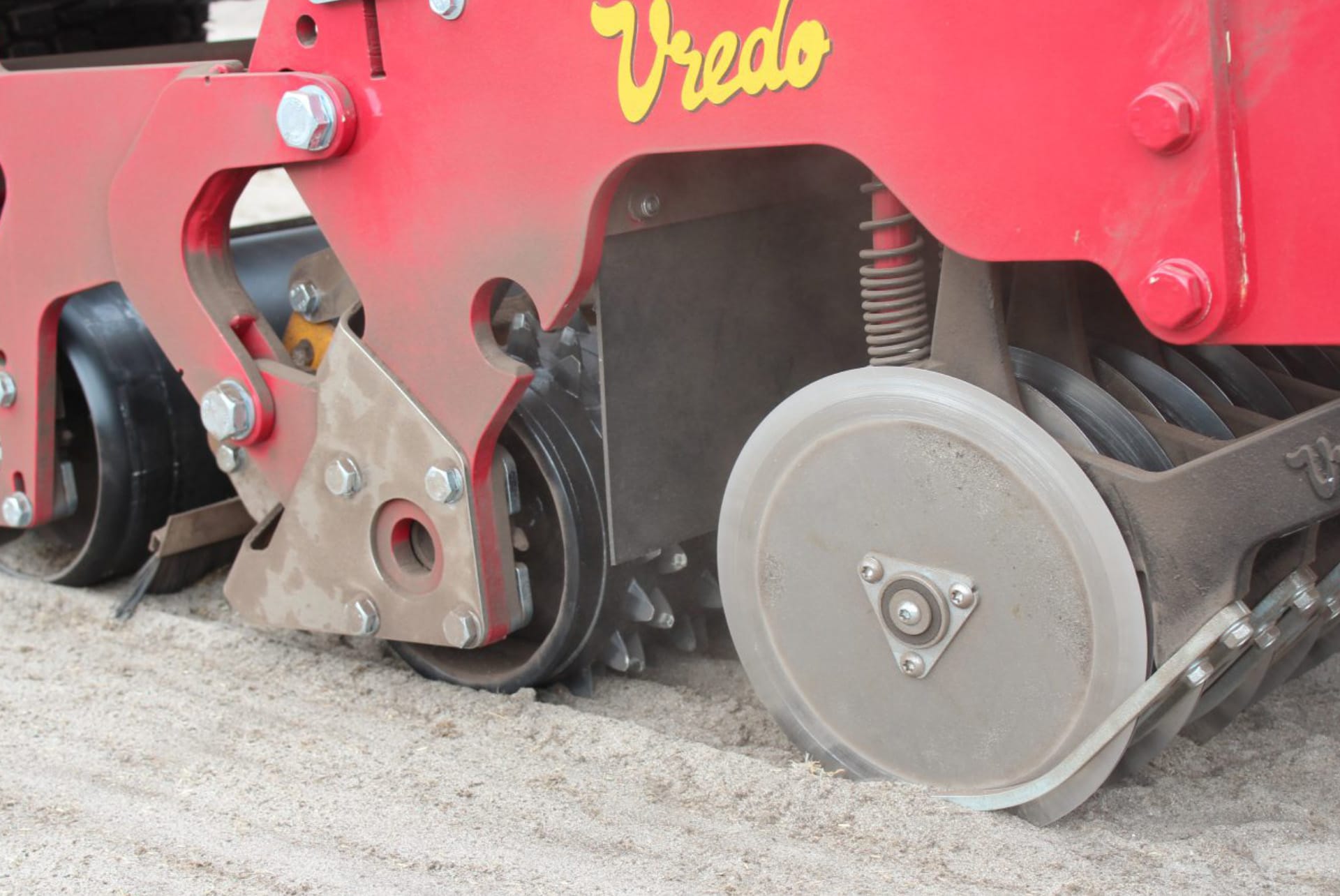 The Vredo Synergy Compact offers the advantages of the double disc system with a row spacing of 70 mm combined with the distinctive “Stitch roller”. This roller sows with flat, sharp teeth instead of the commonly used conical points. In the resulting short cuts with a row spacing of 23 mm, the seed is really locked into the soil. This achieves the same germination results as seed inserted in the soil using the double disc system.